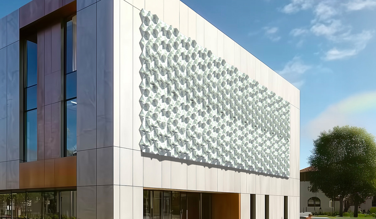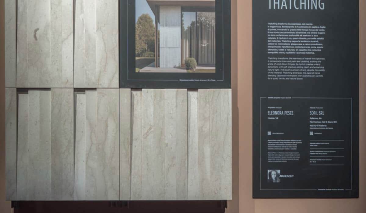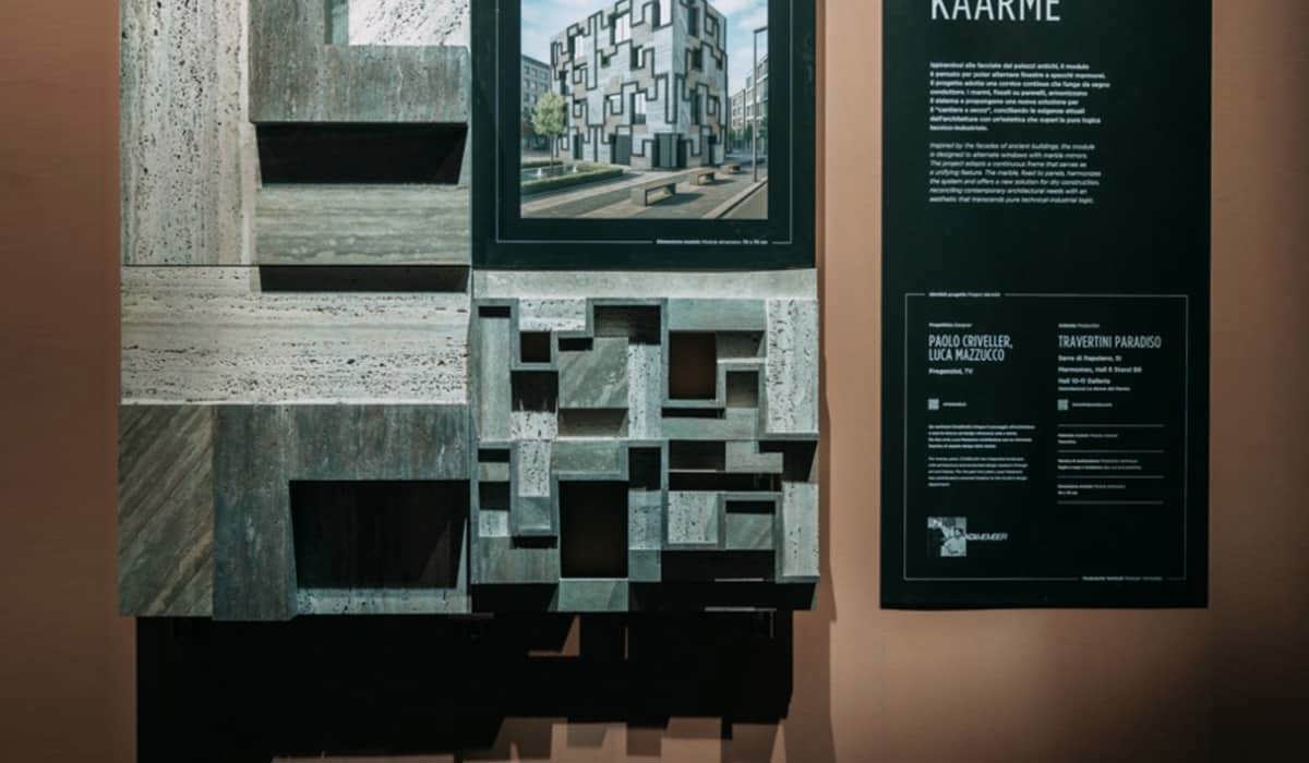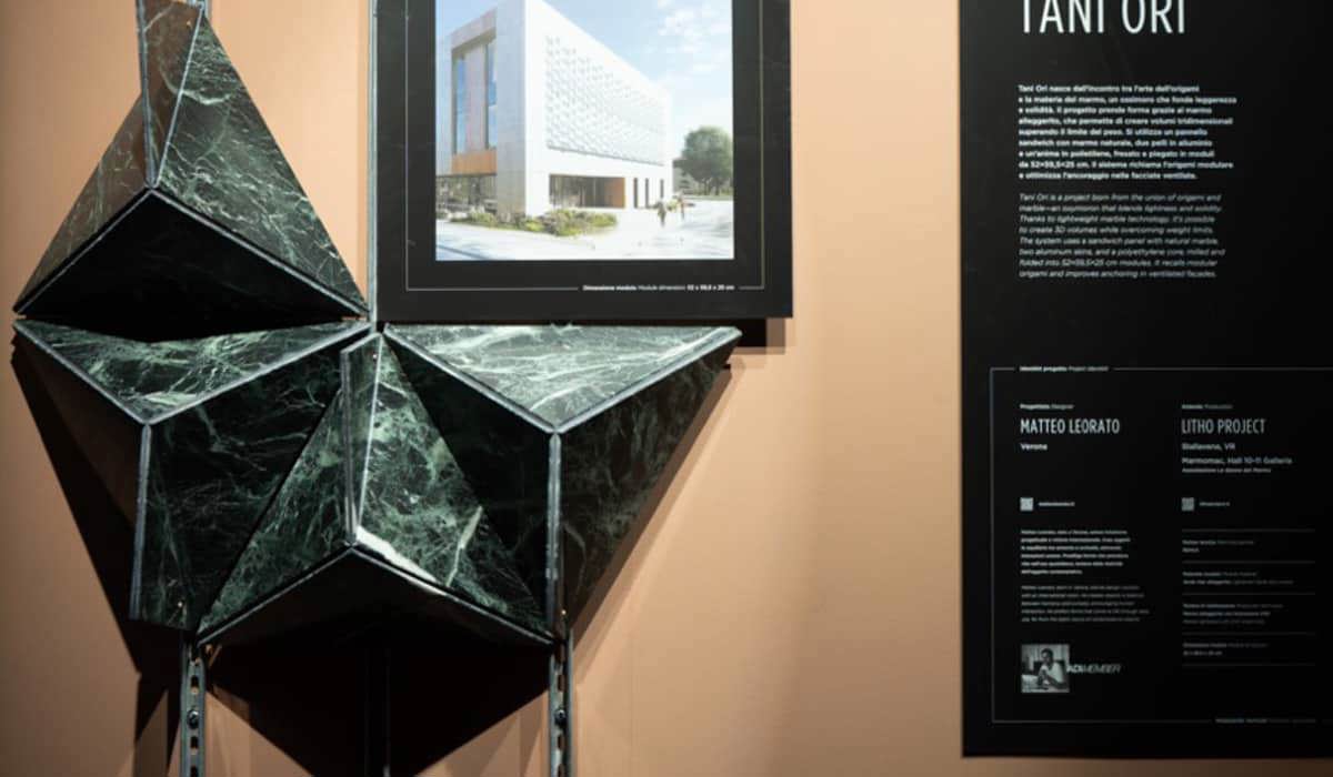 The system uses a sandwich panel composed of natural marble, two aluminium skins and a polyethylene core, CNC-machined and folded into modules measuring 52 × 59.5 × 25 cm. The design recalls modular origami principles and optimises anchoring for ventilated façades.