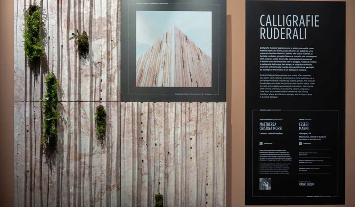 Ruderal Calligraphies explores how stone, often regarded as a static, inert material, can become a living substrate, as a bio-receptive facade. Inspired by ruderal species, the modular facade features cracks and porosity that capture seeds, water, and soil, encouraging spontaneous colonisation. Red marble shifts in tone with rain, revealing the water’s calligraphy. Over time, the mineral surface transforms into a living interface, where architecture, geology, and ecology merge in a poetic dialogue.