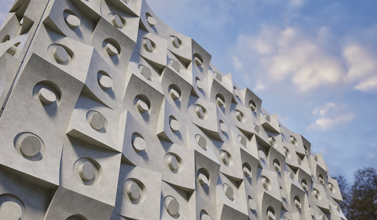 Concavoconvesso is a module designed for offsite construction systems. The design draws inspiration from the plasticity of Croatian artist Ivan Picelj’s relief works, playing with contrasts of light and shadow. The rotation of the elements creates a vibrant surface that changes with the sun’s path, with both sharp and soft chiaroscuro effects. The panels feature a curved connection between their minimum and maximum thicknesses; at the center, a hollowed-out circle surrounds a truncated cylinder with a slightly bulging surface. The overall result is never identical.