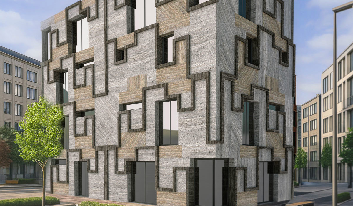The proposal for modular marble slabs features geometric processing achieved through CNC milling, creating an elegant union between nature and architecture. Marble, with its unique veining and natural luster, imparts refinement and timelessness to building facades. The geometric processing adds modernity and dynamism, creating plays of light and shadow that enhance the surface and provide compositional depth. This design not only celebrates the material’s intrinsic beauty but also invites reflection on the relationship between form and function, natural and artificial. It exemplifies how craftsmanship can transform traditional elements into contemporary works, enriching urban spaces with understated elegance and distinctive character.