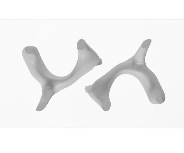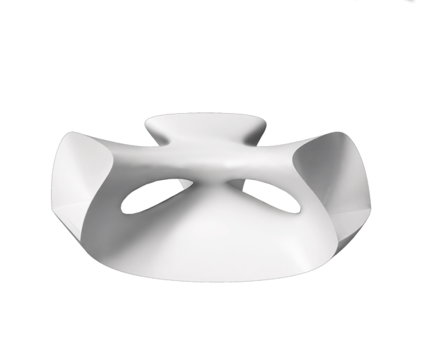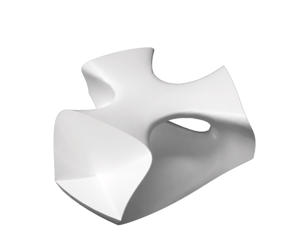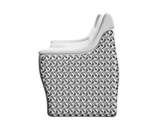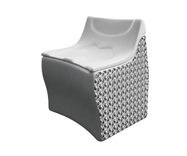 The load-bearing structure of the chair is based on a gyroid geometry, a mathematical structure belonging to the class of minimal surfaces. The gyroid is characterised by a repetitive grid extending infinitely in three dimensions, composed of interconnected curved and twisted surfaces that form a network of channels allowing air to pass through the structure.