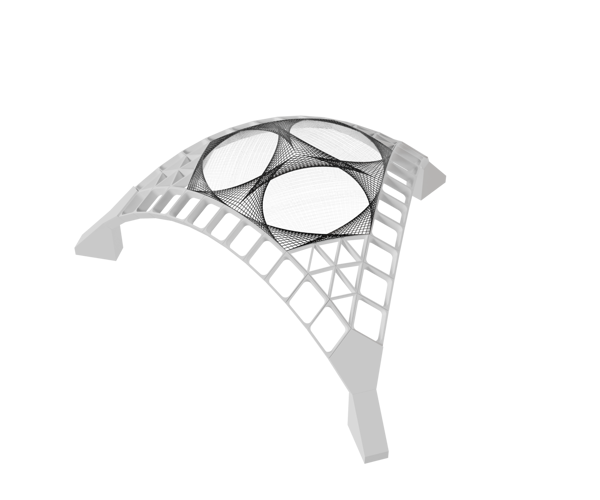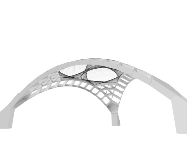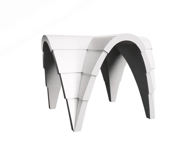 The Stereotomic Tripod is a triangular vault composed of hollow elements produced through 3D printing and shaped to create different patterns. The edges are characterised by quadrangular voussoirs, while the corners are filled with a triangular pattern.