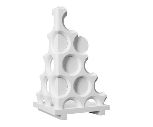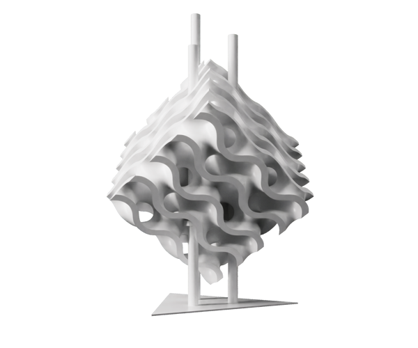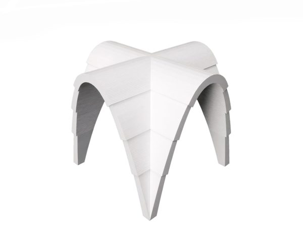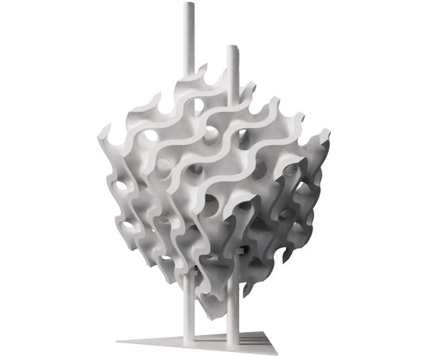 The artefact’s geometries are designed using a procedural algorithm aimed at demonstrating the structural performance of minimal surfaces known as gyroids, which allow for a significant reduction in structural weight without compromising mechanical performance.