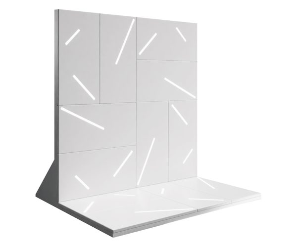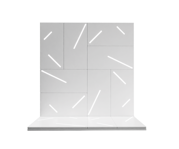 OverThree is a decorative, modular marble partition wall inspired by the waves and reflections of the water surface. It consists of three identical slabs that are repeated and rotated by 90° and 180°, then inserted into a specially designed base.