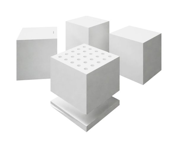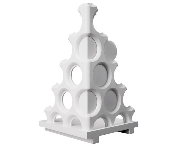 The pieces made from recomposed coral breccia contain fragments of recycled glass that illuminate when struck by artificial or natural light, simulating the glow of stars. The term stereotomy derives from stereoma and refers to the discipline concerned with the scientific cutting of stone to construct vaulted spaces.