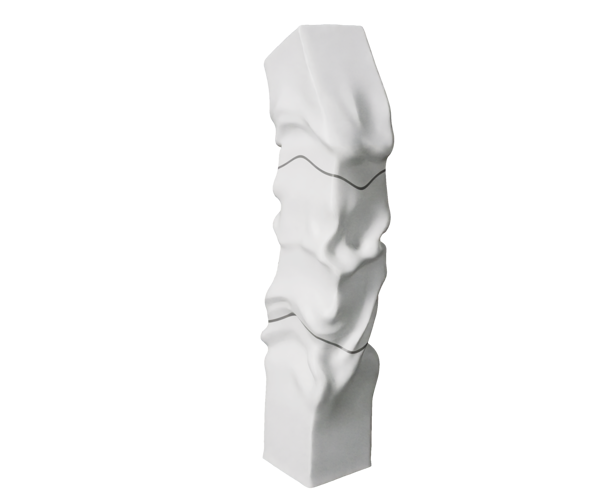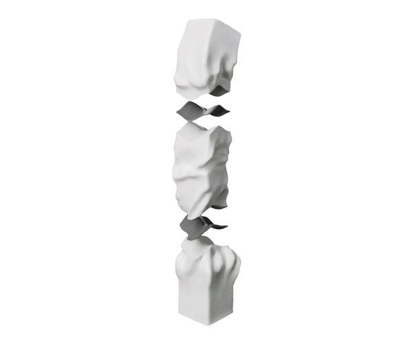 The sculptural project consists of three elements made of Swiss Cristallina marble, joined by two flexible pneumatic joint elements produced through 3D printing. In addition to ensuring a soft connection between the marble blocks, these joints guarantee adhesion through the micro-suction cup configuration of their components.