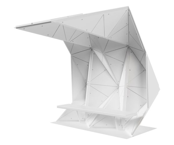 Stone Origami is a fragment of a roofing system inspired by the triangular geometry of origami. The prototype is conceived as an urban shelter for passers-by and travellers. It features a multifaceted geometry composed of assembled two-dimensional elements.