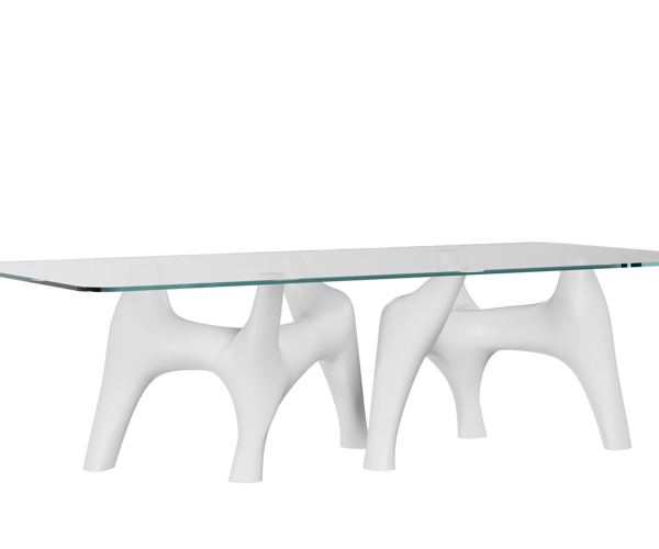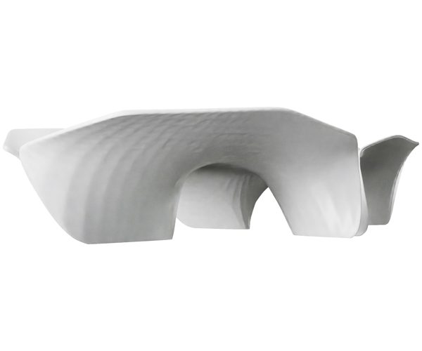 The object has the potential to become modular and to be used as a component within other structures. Particle-Trail uses two arch-shaped structures (identical but mirrored) that form the load-bearing structure of a table. Originally conceived as a set of 3D-printed components, the project ultimately aims to exploit advanced subtractive fabrication technologies to design and manufacture furniture in natural stone.