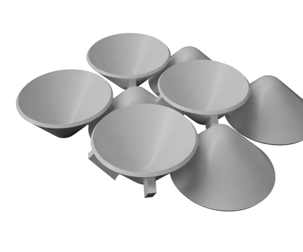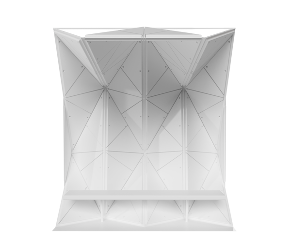 The resulting panels can be endlessly assembled through mechanical metal connections to create complex forms generated by the triangular composition of elements. The construction system can be easily disassembled and reassembled, allowing for multiple formal configurations using the same components.