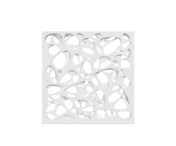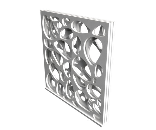 Each slab features perforations which, when positioned against one another, generate dynamic plays of light and shadow.