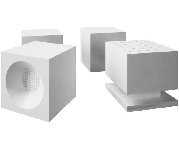 The seating elements are part of a broader system currently under development, integrating stone processing with advanced sensing and Wi-Fi communication systems. The four prototypes on display correspond to a series of sensory experiences, each based on one of the five senses.