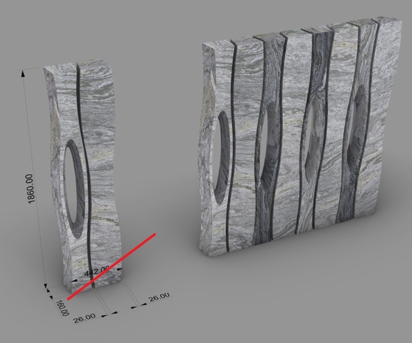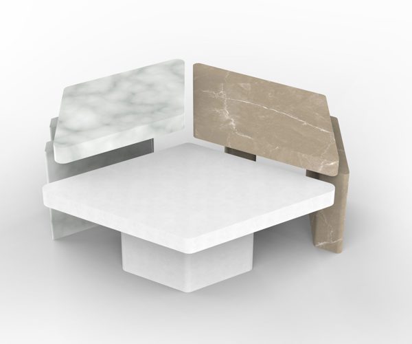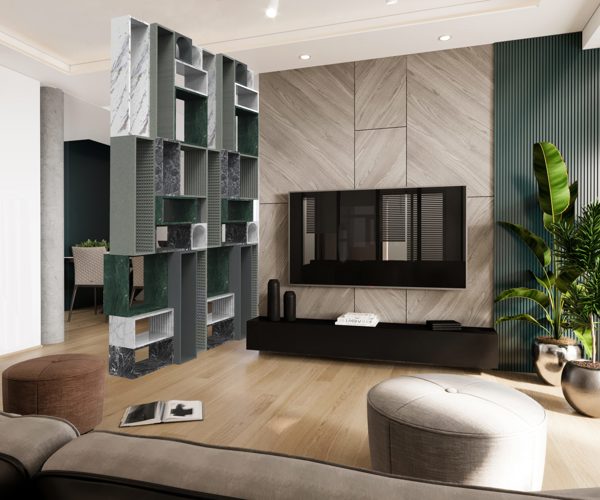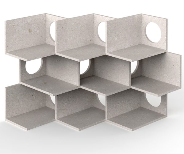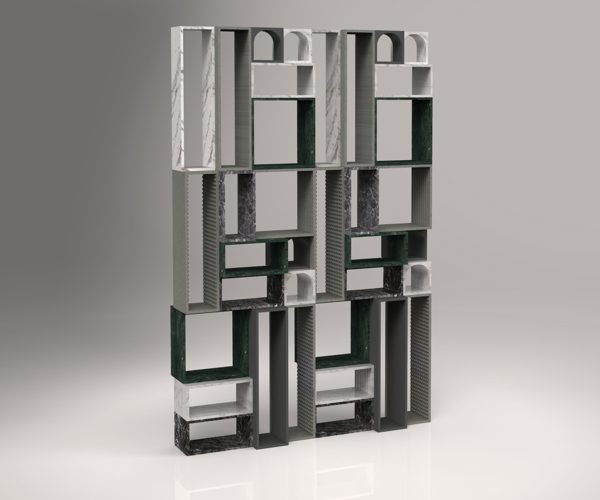 A design element made from selected marble processing waste that combines aesthetics, functionality, and craftsmanship. The project aims to create a partition element that can be assembled in various configurations to create bookshelves or dividing walls. The modular approach allows to make different configurations. The modules are sized based on what usually remains as residue from processed slabs and blocks and are dry-fitted together with steel anchors. The textures on the marble are created with disc cutting and CNC milling.