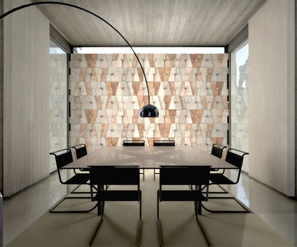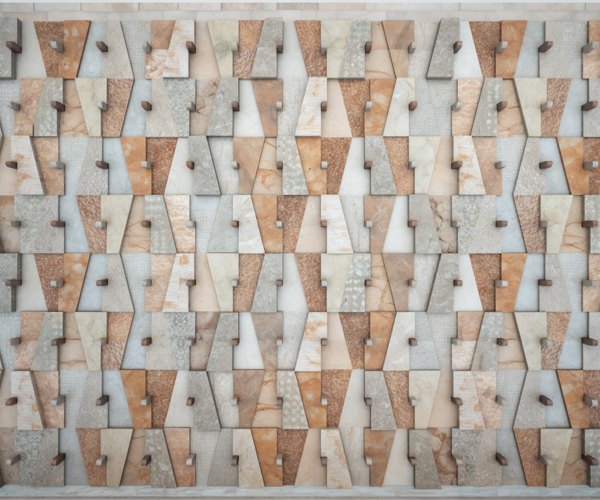 “Cunei e Forme” is a wall cladding system for enhancing and recovering the Lessinia Stone and Rosso and Verdello Trento Marble. Starting from a basic design, the cladding elements and decorative wedges are obtained from waste sheets or offcuts; these will then be finished by hand according to traditional historical techniques. The different thicknesses of the starting slabs will create a vibrant play of shadows on the wall. The wedges simply inserted into the central hole can change position for the owners’ fun.
