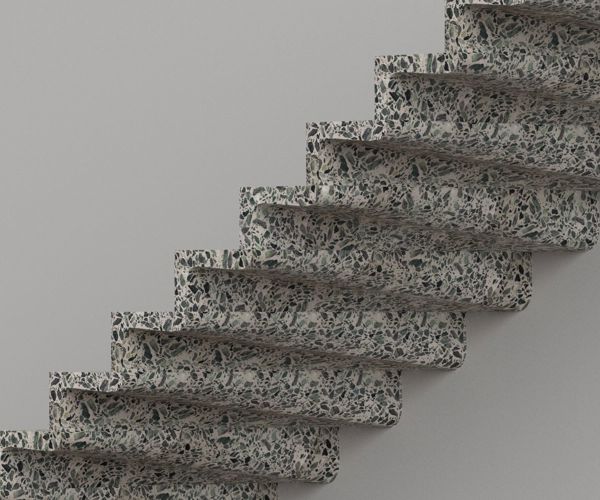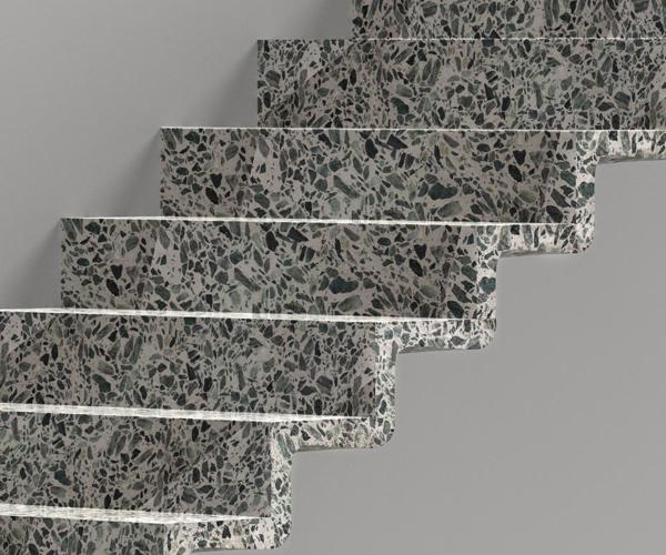 Agglotech terrazzo is the result of an industrial process that combines natural elements, such as marble chips, with cement and water without the addition of resins. Machining with 5-axis CNC machine. The pre-finished ones are obtained with diamond disc cuts. Subsequently, a combing is performed with the diamond disc. The finishing sanding is done by hand.