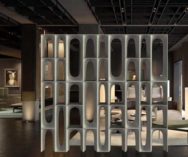 The concept draws inspiration from the main theme of the exhibition by paying tribute to one of the most important international architects of the 20th century: Oscar Niemeyer. The proposed module takes up the features of the arches designed in the building designed in 1965 for the headquarters of the Mondadori publishing house in Milan. The intention is the creation on a reduced scale of the building’s arches, broken down into individual modules, so as to leave interpretative freedom in the possible compositions that can be created, creating games of full and empty spaces, or games of reflections, coupling mirrored glass in the background, without neglecting the possibility of displaying objects placed under the arches. Without forgetting the practicality and concreteness that each project requires