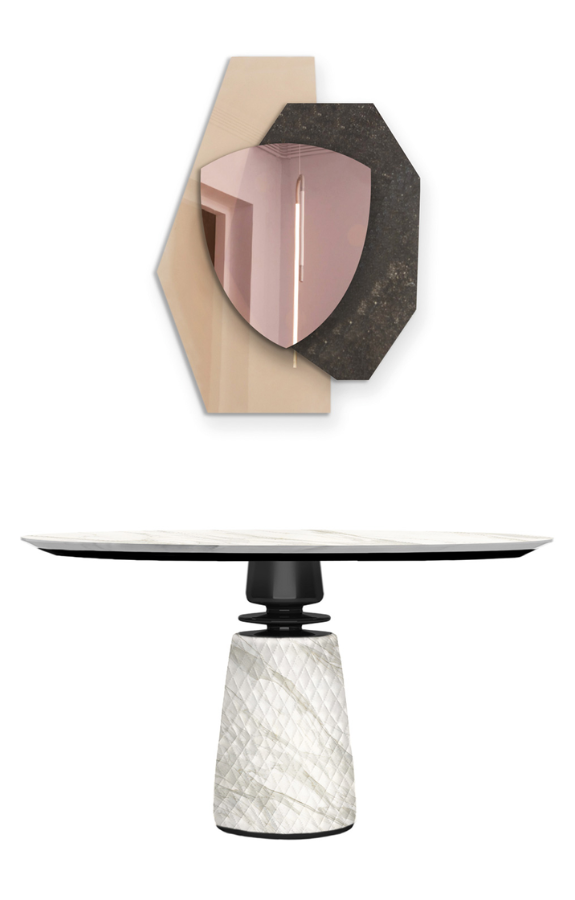 Il Modello TL-2491, tavolo da pranzo e specchio, fa parte della più recente collezione Tonino Lamborghini Casa, il volume 6, caratterizzata da uno stile nuovo per il brand, molto decorativo.