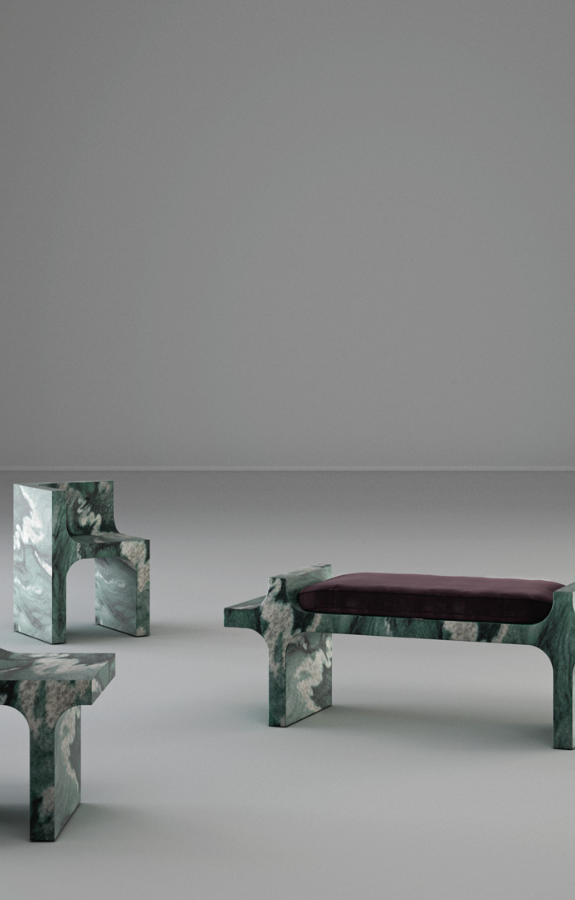 Le geometrie pure, le volte e i volumi pieni in cemento delle architetture di Chandigarh sono reinterpretati, delineando la poetica dei pezzi d’arredo, esaltando la qualità della materia prima, il marmo.