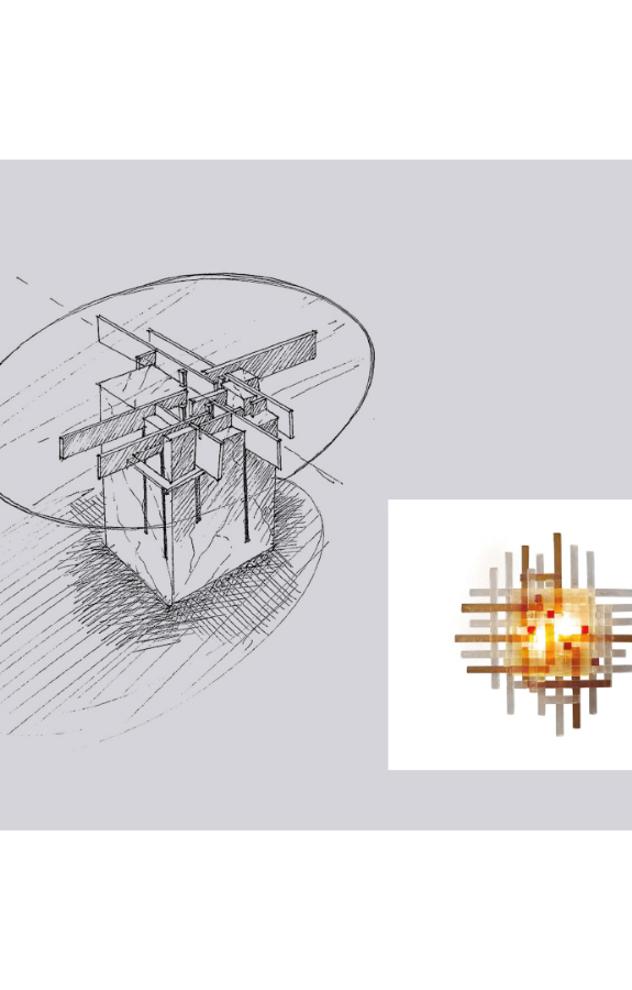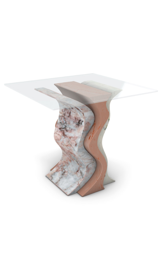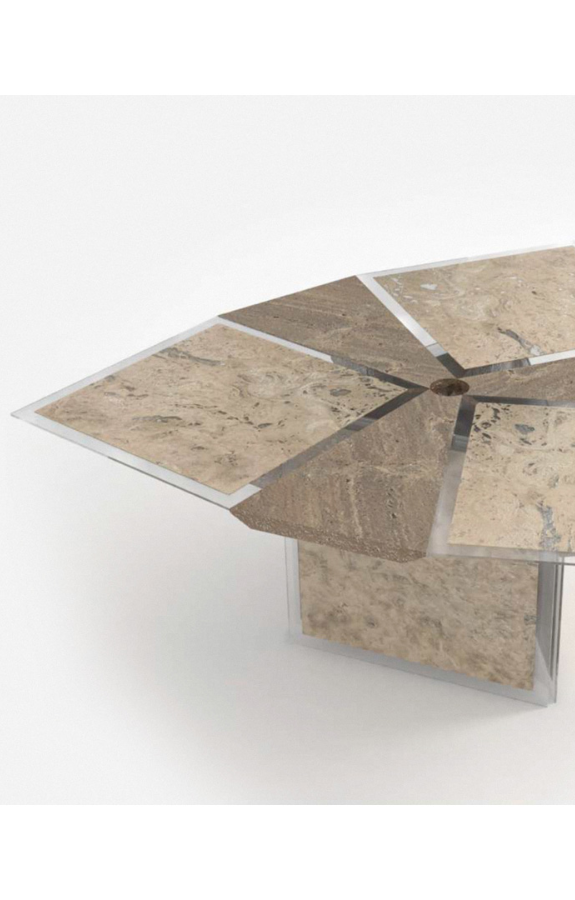 Il tavolo è formato da sei lastre quadrate di vetro temperato (dimensioni cm 73) sulle quali viene incollata una lastra di travertino classico dello spessore di 2 mm. Tre di queste lastre diventeranno le gambe del tavolo e le altre tre, insieme al travertino noce di spessore cm 3, il top. Si è scelto di lavorare su spessori minimi per avere meno spreco di materiale e quindi un tavolo più ecosostenibile. La parte centrale del tavolo ospiterà un vassoio realizzato con le polveri della lavorazione del travertino che a loro volta verranno messe in mostra. In questo tavolo non si avranno scarti di produzione e si potrà leggere il trascorre del tempo in tutte le sue fasi di lavorazione. All’interno del tavolo verrà posta una luce per sfruttare l’effetto trasparenza grazie agli spessori minimi del travertino.