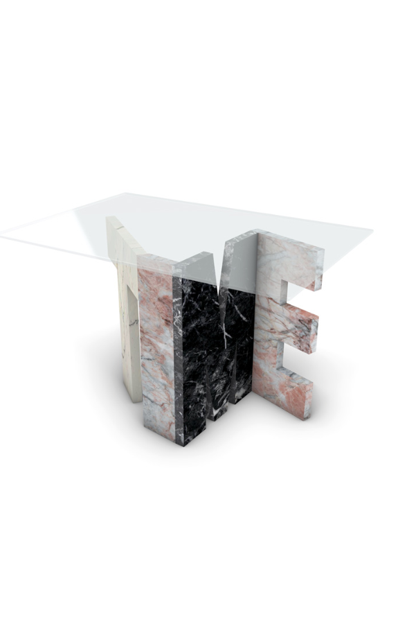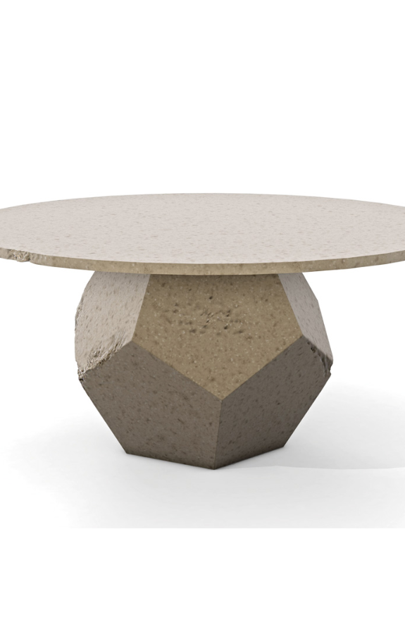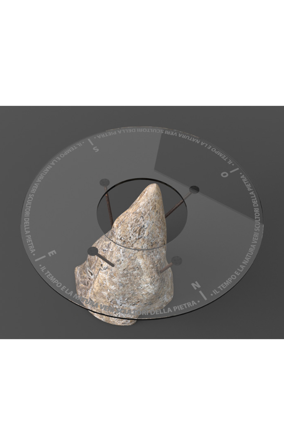 Il tavolo è composto di una roccia alta circa un metro che ne costituisce il centro e da un anello di cristallo che funge da piano. La roccia è un elemento identificativo primordiale rispetto alla pietra lavorata: la sua forma dettate dalla natura e dal tempo diventa elemento significante dell’oggetto stesso che si esplicita nella scritta presente nel cristallo: «Il tempo e la natura veri scultori della pietra».