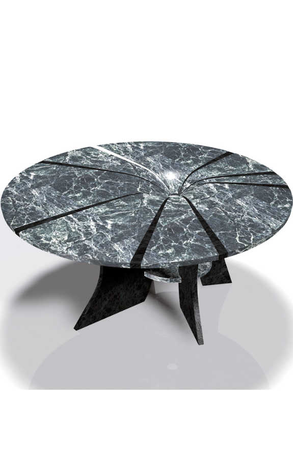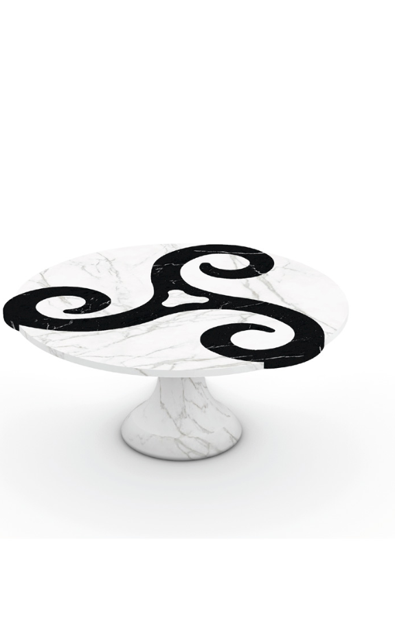L’universo, il DNA umano sembra muoversi a spirale, la spirale è simbolo di dinamismo, continuità ciclica come il flusso del tempo, la spirale come energia del cambiamento, dell’evoluzione, il moto dell’energia universale, dal centro verso l’esterno dell’universo, attraverso lo spazio e il tempo. La tripla spirale TRISTELL, simboleggia le tre forze della natura, creatrice, conservatrice e distruttrice. Nel mondo celtico significava i tre momenti del moto del sole, il passare del sole il passare del tempo. Il tavolo TRILL rappresenta questa tripla spirale, eseguito con due tipi di marmi, Carrara statuario per la base e il piano, marmo nero Marquinia per la tripla spirale, lavorazione water jet e incastro a filo con lieve spazzolatura di superficie. Ogni pezzo è unico, ripetibile nella forma ma non nella materia.