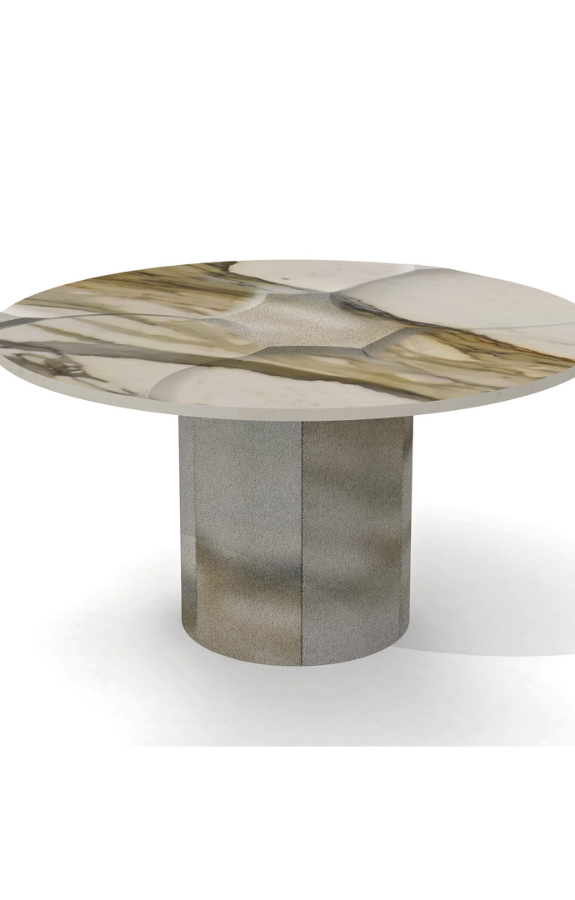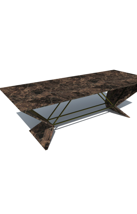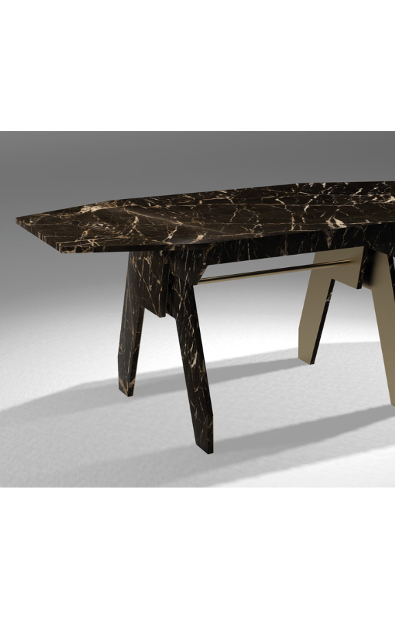 La forma ottagonale del tavolo si ispira alla morfologia dei cristalli contenuti nei materiali lapidei, è un processo metamorfico e temporale grazie al quale il carbonato di calcio presente nel calcare e nella Dolomia si cristallizza dando vita a cristalli di calcite o di dolomite. Il tavolo è ricavato da una unica lastra in marmo da 245x130X2 cm H, cm dal quale si ricavano le gambe, il piano e Il traverso del cavalletto, assemblato con parti di acciaio inox. Il marmo “Blu Masaccio” estratto da una delle cave di Zanella è rinforzato con fibra di carbonio. Progetto sostenibile, risparmio di materia, smontabile, peso complessivo 130Kg, ingombro imballo 200x100x20 cm H, riciclabile.