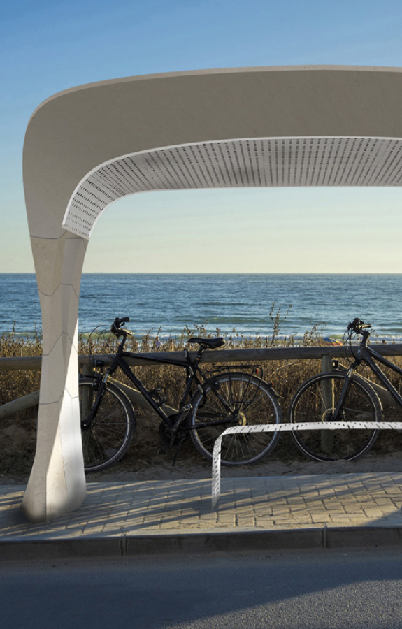Fleur de Ville è un progetto di pensilina ispirata alle forme organiche della natura e costruita principalmente in pietra naturale al fine di utilizzare materiali locali (pietra di Apricena) resistenti e preferibilmente con una bassa impronta ecologica. Le forme sinuose della pensilina s’iscrivono in una visione concettuale che mette insieme la tradizione dei materiali con l’innovazione della morfologia architettonica e della relativa tecnica costruttiva. L’idea di base consiste nella “litizzazione” di una forma floreale che apporta benessere visivo nell’ambiente in cui si colloca, e protezione e riparo dagli agenti atmosferici durante il periodo di sosta.
