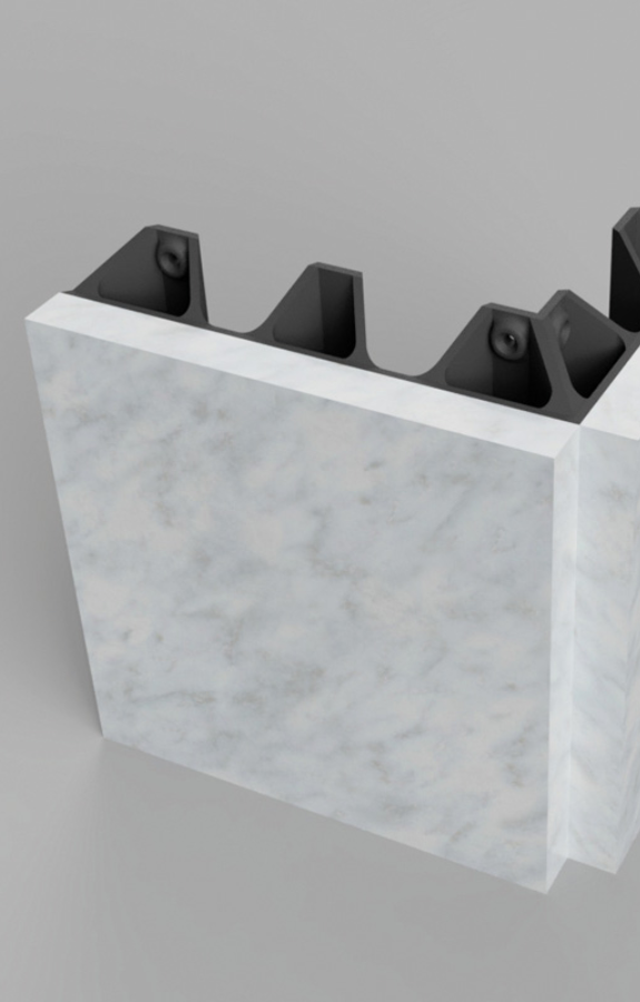 Concepito come evoluzione dei tradizionali pannelli compositi di marmo leggero, il pannello Breathing Stone sfrutta i vantaggi della stampa 3D per realizzare un elemento costruttivo altamente sostenibile e adattabile a qualsiasi esigenza progettuale. Il pannello realizza una facciata ventilata integrando la finitura lapidea con le prestazioni energetiche del supporto. Il materiale utilizzato per il supporto è riciclato e riciclabile, ad alta resistenza meccanica e resistente agli agenti atmosferici.
