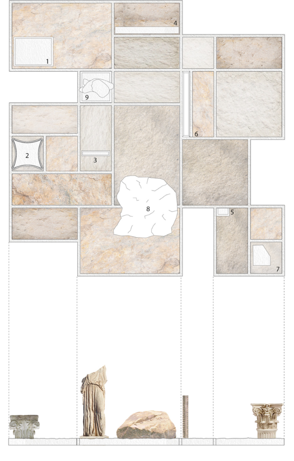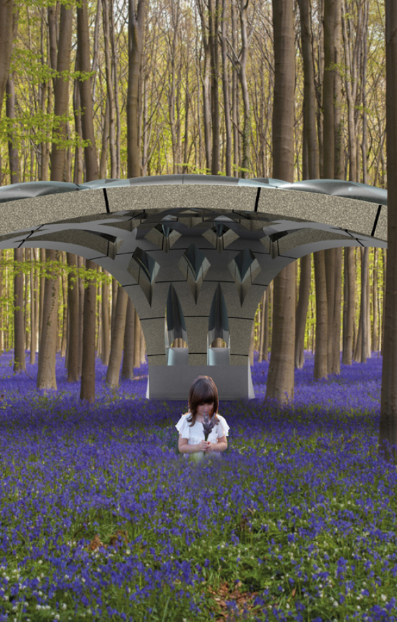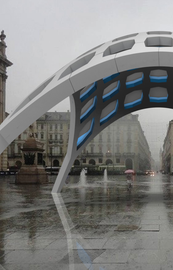 Il progetto propone un sistema di copertura traforato composto da archi incrociati in pietra portante. Il progetto è sviluppato su pianta triangolare e le aperture tra gli archi incrociati sono tamponati con cuscinetti di copertura traslucidi in Etilene tetrafluoroetilene (ETFE). Il disegno di una copertura traforata e la combinazione tra materiali pesanti e leggeri è paradigmatica delle nuove frontiere che la pietra può assumere nel solco della Stereotomia 2.0.