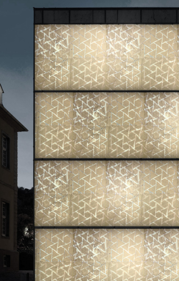Il progetto propone l’utilizzo di lastre in marmo scavate, secondo un motivo parametrico, in modo da ridurre lo spessore del marmo e permettere il passaggio della luce, grazie ad un sistema di illuminazione LED. Il sistema può essere impiegato per la realizzazione di facciate di edifici e partizioni interne. È possibile rendere evidente lo scavo ponendolo sulla facciata a vista, oppure nasconderlo nella parte interna e renderlo visibile solo quando il marmo è retroilluminato. La dimensione delle lastre e i motivi geometrici sono totalmente personalizzabili.
