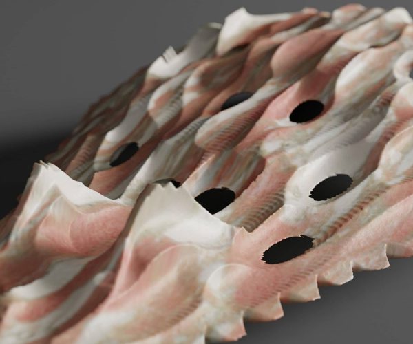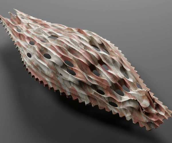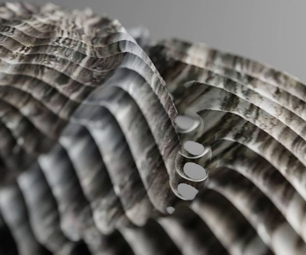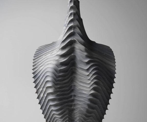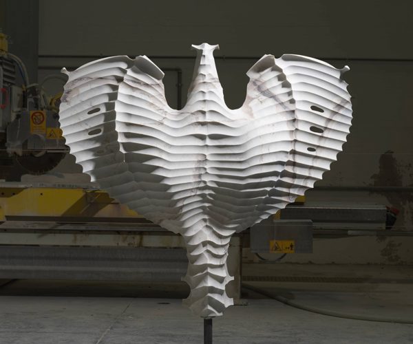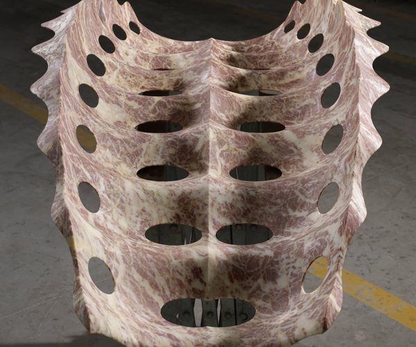 L’apparente fragilità dello scheletro litico nasconde una sapiente progettazione strutturale computerizzata e una precisissima lavorazione numerica. Immaterialità digitale e materialità litica si fondono in questa grande struttura toracica come una sorta di residuo ignoto di un mondo immaginario.