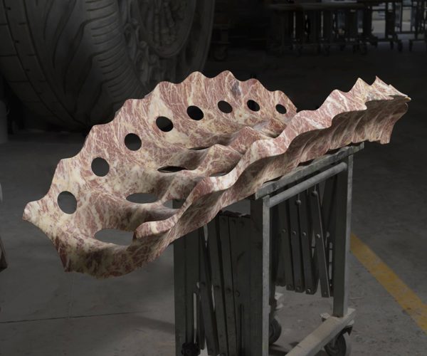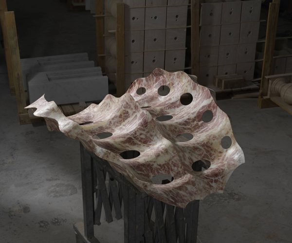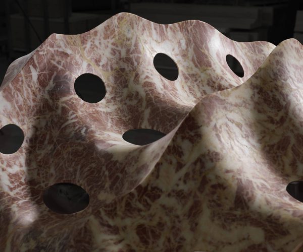 L’essenzialità dei percorsi di fresatura a disco si contrappone con la forte organicità viscerale della forma. Il marmo Rosa Peralba, appositamente selezionato, muta la sensazione percettiva della materia da minerale ad animale.