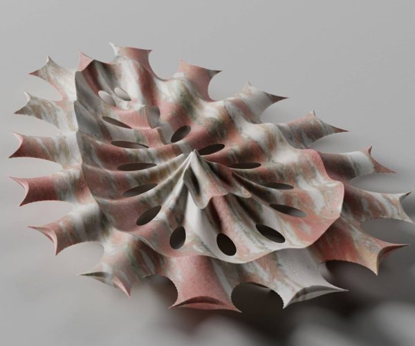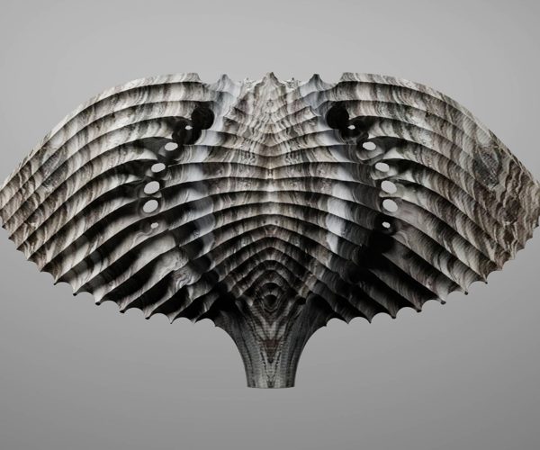 L’opera è concepita come un elemento primario disegnato al computer, dalla quale possono derivare altre forme. Connotata dal marmo Palissandro a macchia aperta, la scultura evoca il mondo ittico e le strutture interne di un essere ignoto. La materia naturale, con le sue irripetibili tessiture, dona l’unicità all’opera potenzialmente riproducibile nella forma.